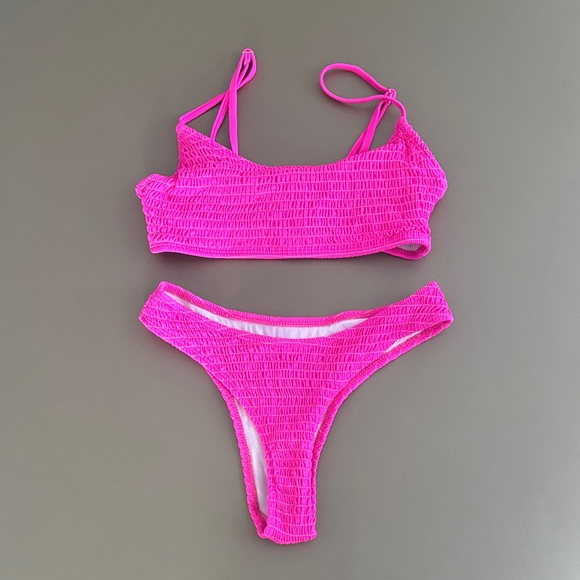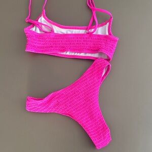 Vibrant pink bikini set with a textured design. Perfect for the beach or pool.