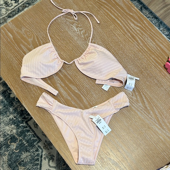 Stylish pink bikini set with a halter top and cheeky bottoms. Perfect for the beach or pool. Abercrombie NWT size medium