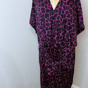 Chic Michael Kors classic wrap dress featuring a striking pink and black giraffe print with a deep V-neckline, relaxed kimono-style sleeves, and a cinched wrap tie-waist detail that flatters the silhouette. Above-the-knee length and soft, flowy fabric make it perfect for work-to-evening transitions, date night, or brunch with friends. EFFORT