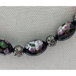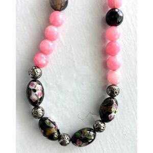 Pink & Black Beaded Necklace With Floral Cloisonné Beads & Silver Accents 14" Le