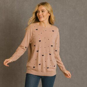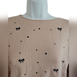Adorable soft pastel pink sweater featuring a black bow and bead accent design across the front and sleeves. Lightweight knit with stretch — perfect for layering or transitional weather.