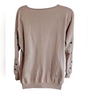 Adorable soft pastel pink sweater featuring a black bow and bead accent design across the front and sleeves. Lightweight knit with stretch — perfect for layering or transitional weather.