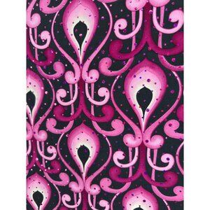 This fabric features an intricate pink and black sparkle design with a smooth stretch. Its durable nature is ideal for sewing projects requiring flexibility.