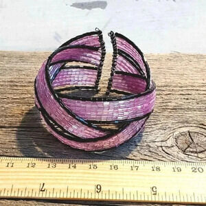 Vintage handcrafted pretzel bracelet features tiny glass beads in contrasting colors. Make with braided memory wire as its base, it easily slides on and off and accomodates almost any wrist size.