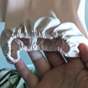 It is a sheet pink Blouse, it has another tie around the neck you can use if you wish. The end of the long sleeves are cinched! It wasn't tight on me but my wrists aren't too big.