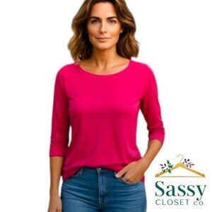 Bright, versatile, and effortlessly chic—this Talbots 3/4 sleeve top features a bold vibrant pink hue, a classic crew neckline, and a tailored yet relaxed fit that transitions seamlessly from workday to weekend. Crafted from a soft, breathable fabric blend, it offers comfort and polish in equal measure. Whether layered under a blazer or styled solo, this wardrobe staple adds a confident pop of color to any capsule.