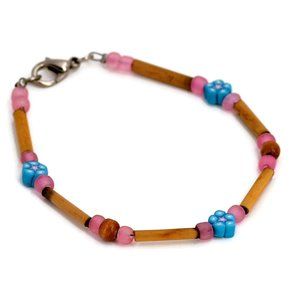 Sweet Fimo Flower Bracelet with Reed Tube Beads and Frosted Pink Beads