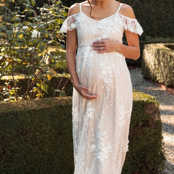 This is a beautiful maternity dress! Nude underlay with white flower decals and a little shimmer throughout. Bought it for an event but ended up not needing it, paid $100 so trying make up some of what I lost, open to offers. Size large but runs on the smaller side so I feel like a large is really like a medium!