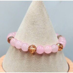 Elegant pink blush quartz bracelet with gold tone bead accents. This handmade piece adds a touch of sophistication to any outfit, perfect for casual or formal occasions.
