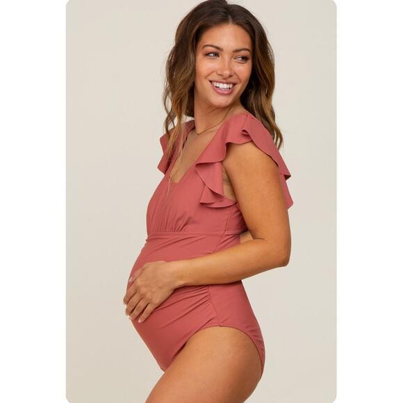 Pink Blush Rust Ruffle Shoulder Pleated Side Maternity One Piece Swimsuit Size L