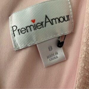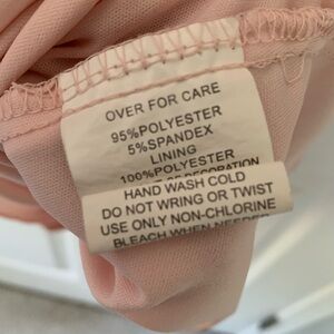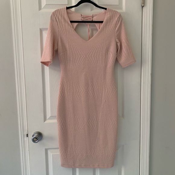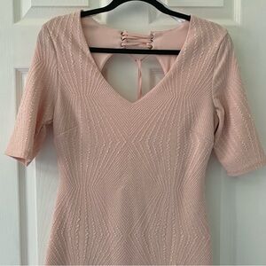 This is a light pink body-con dress with a zipper and tie up detail in the back and 3/4 sleeves