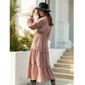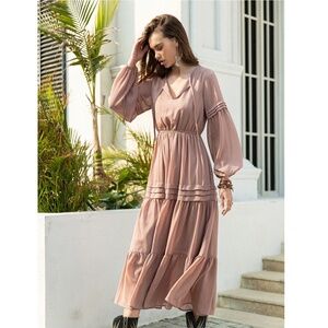Pink Bohemian Maxi Dress Chiffon Neck Ties Long Sleeve Ruffle Hem Flowy