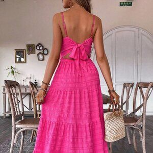 Pink Boho Ladies' Textured Long Slip Dress With Spaghetti Straps