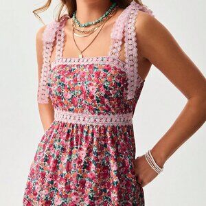 Pink Boho Women's Cowgirl Style Floral Lace Patchwork Dress