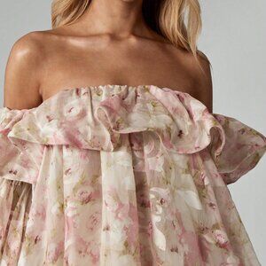 Pink Boho Women's Floral Chiffon Bardot Mini Off Shoulder Ruffle Dress