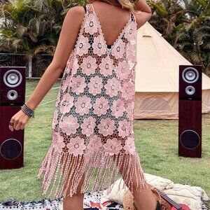 Pink Boho Women's Hollow Flower Tassel Decor V-Neck Sleeveless Tunic top
