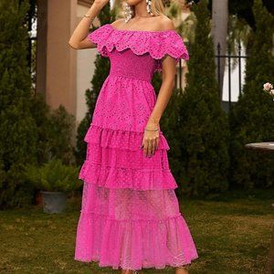 Pink Boho Womens Off Shoulder Ruffle Trim Mesh Overlay Dress