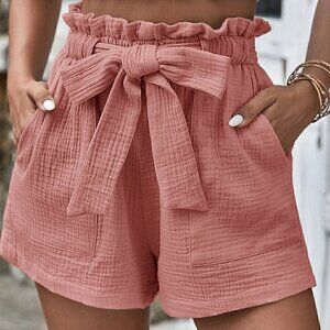 Pink Boho Womens Paper Bag Waist Belted Shorts