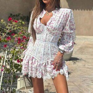 Elevate your wardrobe with this sweet floral lace dress, featuring a vibrant pink hue and a bohemian style. The regular fit dress boasts a V-neckline and long sleeves, perfect for a chic look. Its short length and A-line silhouette create a flattering shape, while the random print pattern adds a playful touch.