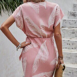 Pink Boho Women's Tropical Print Batwing Sleeve Knot Side Wrap Dress