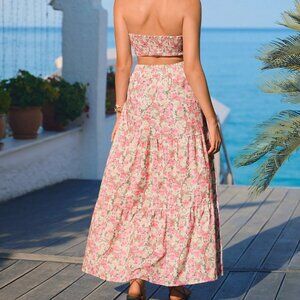 Pink Boho Women's Woven Printed Crop Top & High Waisted Skirt Set