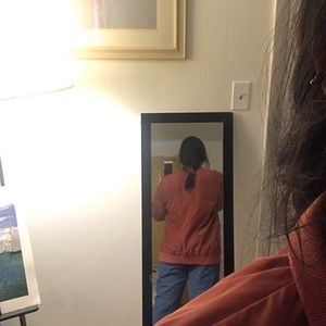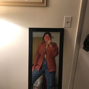 Long, almost A line bomber jacket. Pretty color.
