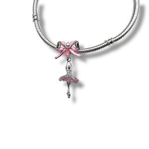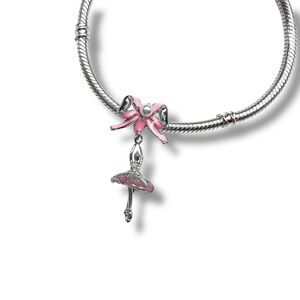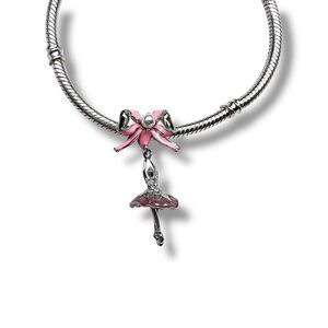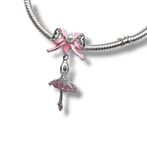 Graceful and dreamy, feminine and whimsical, this ballerina dangle charm captures the elegance of ballet with a pastel twist. Made from S925 sterling silver, it features a dainty ballerina in a pink enamel tutu suspended beneath a large enamel bow accented with a pearl detail.
