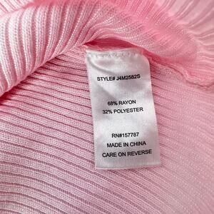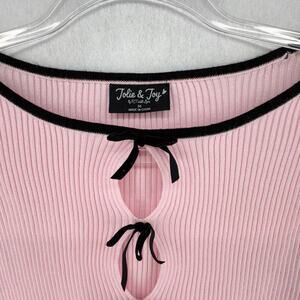 Soft pink ribbed knit top featuring black velvet bow front details and contrast trim neckline. Stretchy fit with a cropped silhouette and feminine, coquette-inspired design. Perfect styled with jeans or a mini skirt for a balletcore or romantic look. Size Small, 68% rayon / 32% polyester. Excellent pre-owned condition. Measurements are approximately, not exact: 15” pit to pit, 16” length.