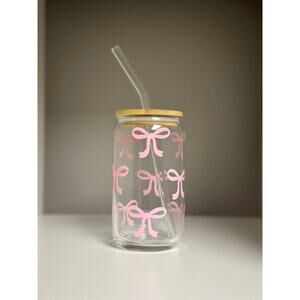 Pink Bow Glass Can with Bamboo Lid and Glass Straw 16oz Summer, Gift Ideas, Keepsakes