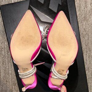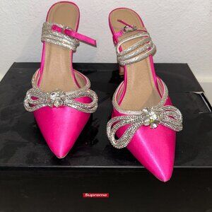 Adorable pink heels with silver rhinestone encrusted band, and silver circle detail at the toe of the shoe. Great dupe for the Mach and Mach shoes that have been so popular!