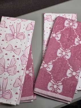 Set of pink and white kitchen towels. Features repeating bow motifs in two complementary patterns. Soft woven fabric with tidy edges. Cute, feminine design for everyday use. 100% cotton