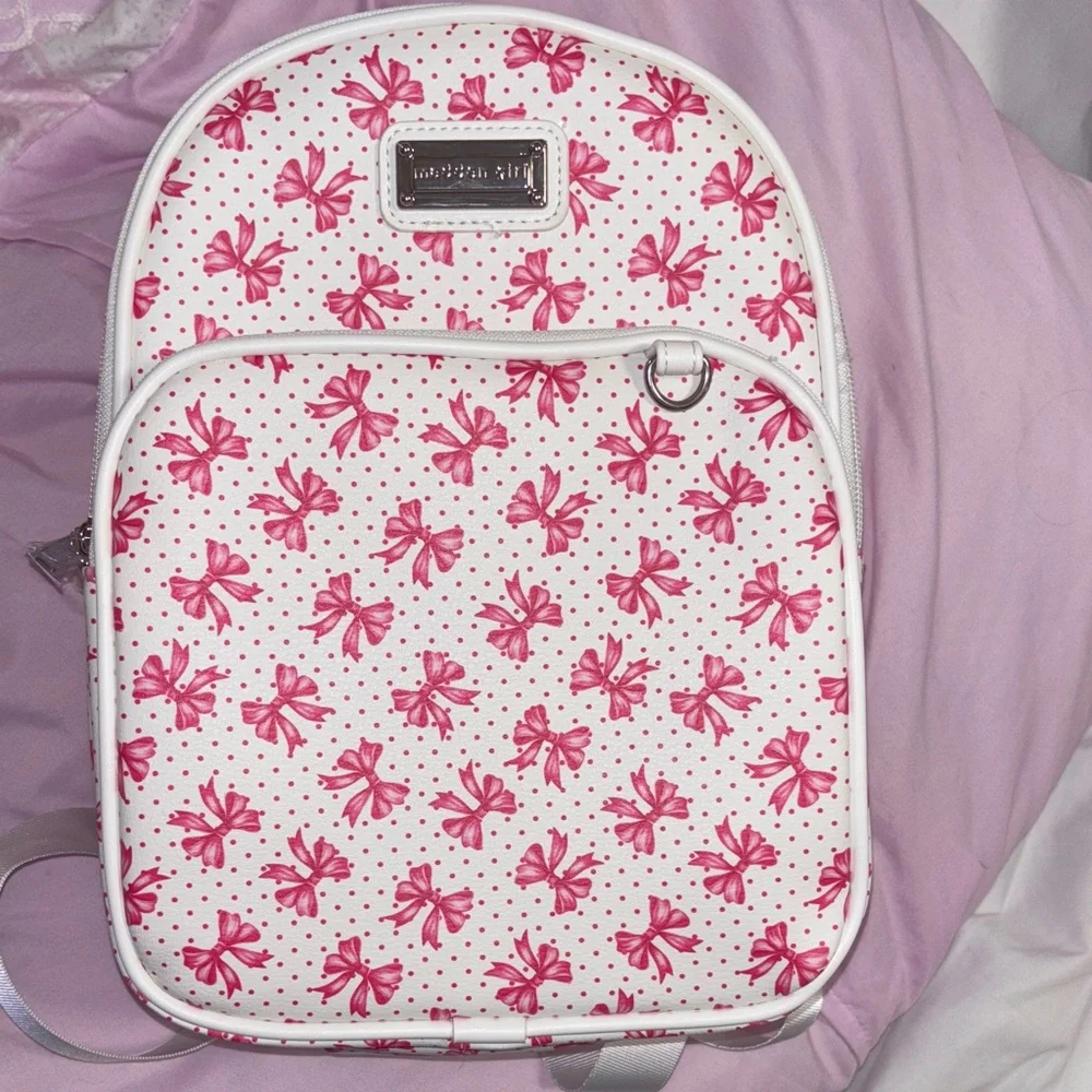 Stylish backpack with pink bow pattern. Features a front pocket and zip closure. Brand new