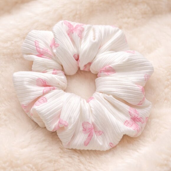 Add a touch of delicate charm to your everyday look with this cozy scrunchie. Made from sift ribbed fabric in white, it features subtle pink ballet bow details for a sweet, feminine feel. Gentle on hair and stretchy enough for all hair types, this scrunchie is perfect for ponytails, messy buns, or wearing on your wrist as a cute accessory. Handmade with care, it's the perfect blend of comfort, softness, and ballet-inspired elegance.