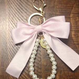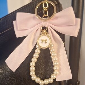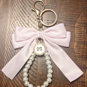 Pink bow and pearl bag charm. Perfect for adding elegance to any outfit, backpack, handbag, or keychain. Gold hardware. Hangs 5".