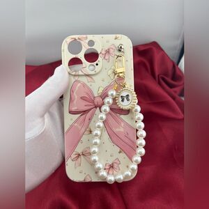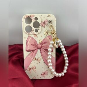 Elegant phone case featuring a pink bow design and a pearl charm. Perfect for adding a touch of style to your device.