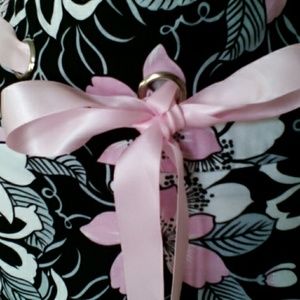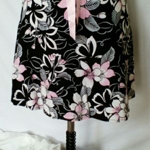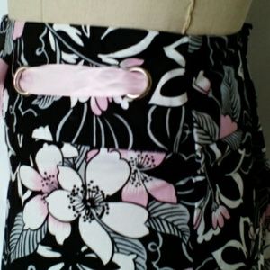 This skirt has a black background, with light pink and White flowers, there is a pink ribbon that tie into a bow in the front, it zips in the back.