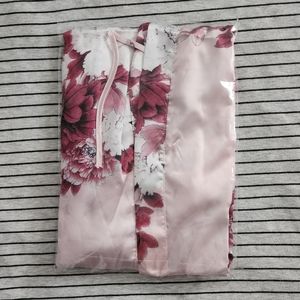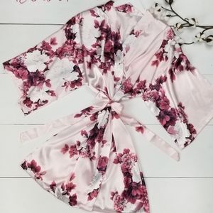 Light pink floral print bridal robe. Belt loops and inside ties. Satin. Size fit 0-12. #bridal #robe