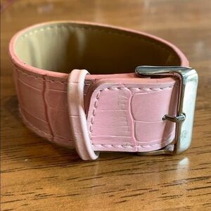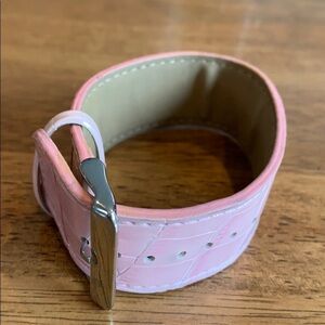 Pale pink Tan interior Silver buckle Snake skin or reptile print Adjustable Interior shows cracking