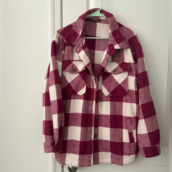 Stylish women's shacket in pink and cream buffalo check. Soft, structured fabric with front button closure and flap chest pockets. Versatile layering piece that pairs easily with denim or knitwear. Featuring pink and cream colorway for a fresh, casual look.