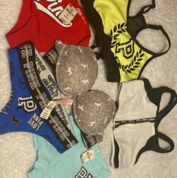 Brand new two Pink sports bras. One pink super push up bra. Three brand new panties with tags. Originally $10.50 each. All lastest styles. Bought at xmas time.