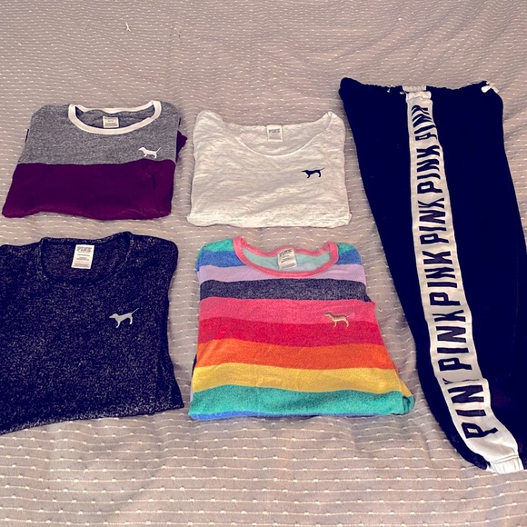 Pink bundle. Good used condition. 4 tops various sizes (in pics) one pair of joggers.
