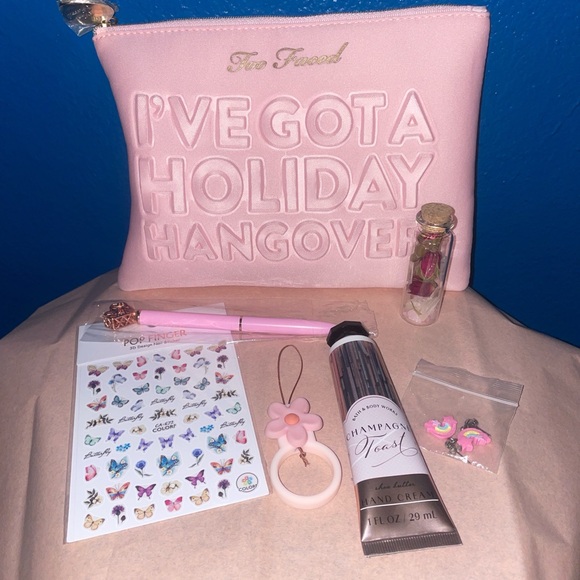 Includes, “I’ve got a Holiday Hangover” Too Faced Makeup Bag, Silicone Finger Ring Strap for Smart Phone, A heart pen, Butterfly/Floral Nail Stickers, a jar of authentic rose quartz crystals and clear quartz crystal wands with rose buds, A pair of rainbow star dangling earrings and a travel size Bath & Body Works Champagne Toast Lotion.