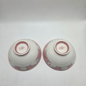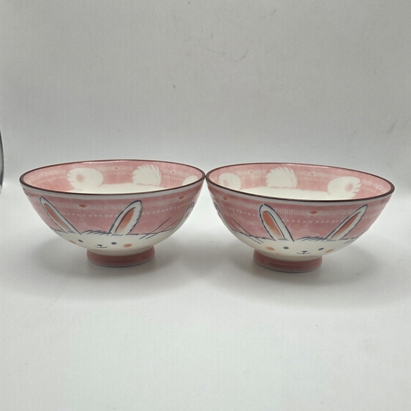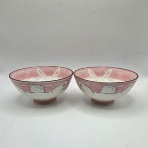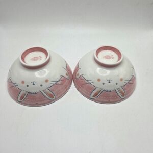 Charming pink ceramic Japanese ruce bowls featuring adorable bunny designs. Perfect for adding a playful touch to your home decor. Holds 3/4 cup, 5" Diameter, 2" H, Pre Owned, Great Condition