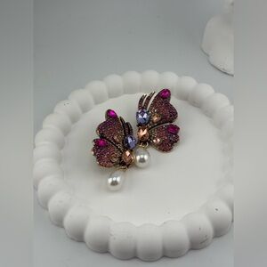 Make a bold and elegant statement with these beautiful butterfly-inspired earrings. Featuring sparkling crystals in shades of pink, purple, and champagne, finished with a delicate pearl drop for a touch of sophistication.