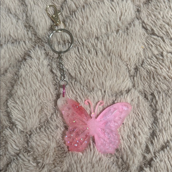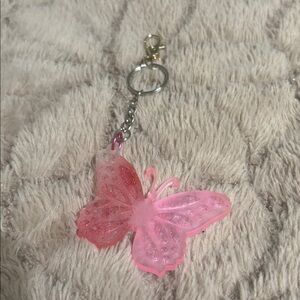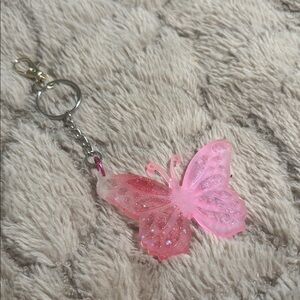 Charming pink butterfly keychain with glitter accents. Perfect for adding a whimsical touch to your keys.