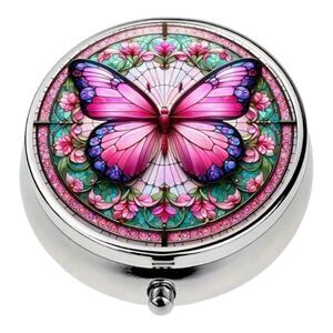 Pink Butterfly Pill Box Medicine Mini Stainless Steel Case Mirrored Travel Purse