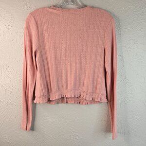 (F642) Charlotte Russe Pink Button Down Cardigan Pink Crop V Neck Ruffle Ribbed Long Sleeve