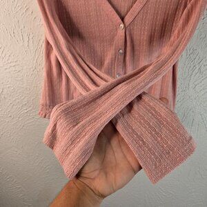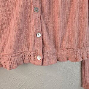 Pink Button Down Cardigan Small Small Pink Crop VNeck Ruffle Ribbed Long Sleeve