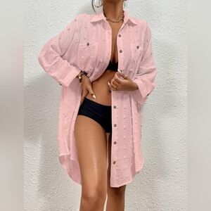 This beautiful pink button down shirt dress can be worn for any occasion and also as a swimsuit cover up!! The fabric has swiss polka dots and is very lightweight, soft and comfortable. Featuring long sleeves that can be rolled up and secured with a button on the cuff and breast pockets with decorative buttons.