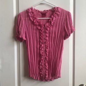 A very feminine fitted pink blouse with ruffle details. Great for adding some color for a day at work!